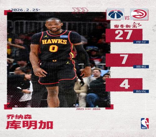 北京时间2月25日,亚特兰大老鹰在主场以119-98大胜华盛顿奇才,收获两连胜。乔纳森-库明加此役迎来老鹰生涯首秀...