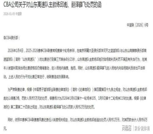 就在昨天CBA突然宣布了一个重磅罚单,这也引起了众怒,原来就是在山东队和南京队的这场比赛中。当时发生了很多小插曲,山东队在被罚下四人的情况下,仍然客场完成了超级大逆转,值得球迷尊重,但此时CBA却突然开出了罚单,首先他们认为主教练邱彪指导在场地指责抱怨,造成了不良的影响,所以对他直接禁赛两场,罚款5万元,同时又因为他是负责人,所以额外追加1万元,