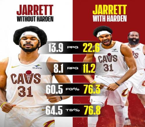 今年赛季中期的交易,哈登和加兰互换东家,哈登加盟骑士,骑士补齐了最后一块冲冠短板:进攻发动机。哈登作为历史最强(或许没有之一)双能卫,虽然已经36岁了,但是老A8还是A8,能力太强了。在快船的前半个赛季,场均25.8分5.2篮板8.2助攻,已经是准全明星级别了,加盟骑士后,他继续放权,专心梳理进攻,场均18.4分4.8篮板8.6助攻1抢断,投篮命中率49.1%,三分命中率48.1%,罚球命中率89.3%,而且球队5胜0负,无死角的强啊!
