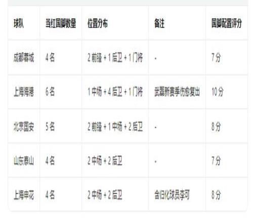 北京国安拥有5名当红国脚,包括2前锋+1中场+2后卫;山东泰山拥有4名当红国脚,包括2中场+2后卫;上海申花拥有4国脚,2中场+2后卫,外加归化李可。