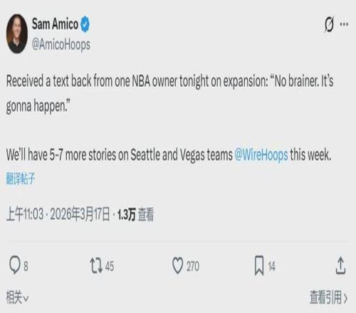 NBA现有转播合同11年760亿美元,本赛季开始生效,2036年到期。每年将近70亿美元,其中大部分要分给30支球队。如今多两支球队分钱,其他球队会答应吗?NBA名记Sam Amico报道,一位NBA球队老板透露,扩军一定会发生。