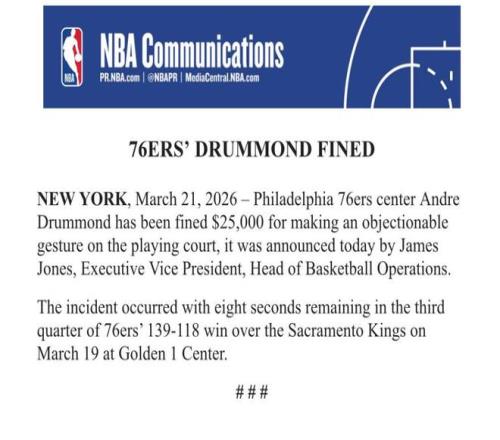 在3月19日76人对国王的比赛中,德拉蒙德在球场上做出冒犯性手势,因此被罚款25000美元。